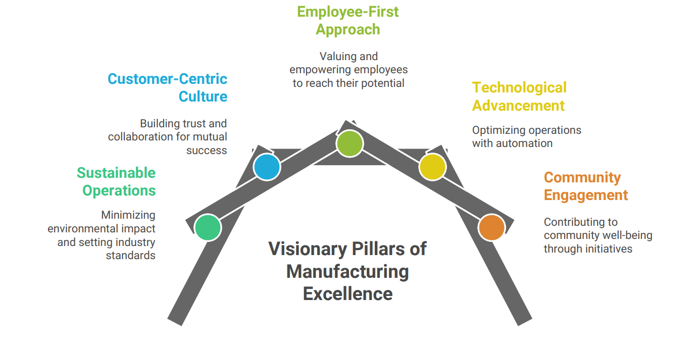 To be a recognized leader in manufacturing, renowned for our innovative products, sustainable practices, and unwavering commitment to customer satisfaction and employee well-being. We envision: