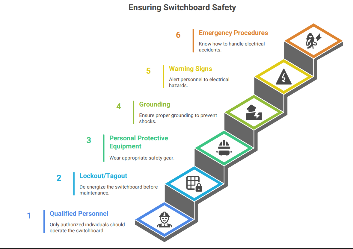 • Grounding: Ensure that the switchboard is properly grounded to prevent electric shock.