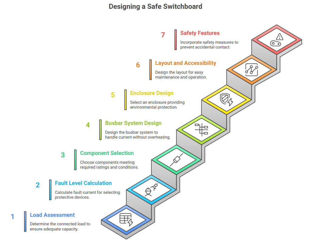 • Layout and Accessibility: Design the switchboard layout to ensure easy access for maintenance and operation. Provide adequate spacing between components and clear labeling of all devices.