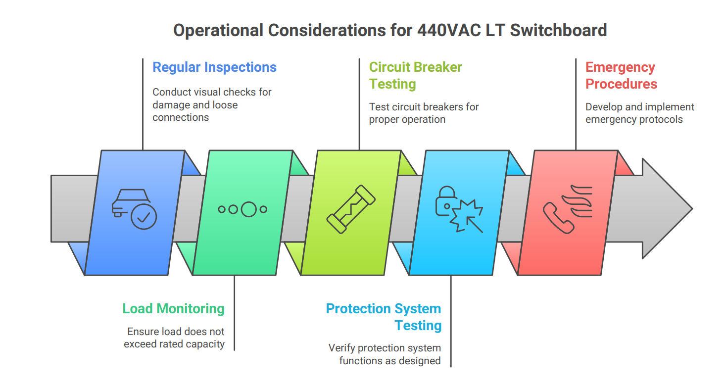 Proper operation of the 440VAC LT switchboard is crucial for ensuring the safe and reliable distribution of power. Key operational considerations include: