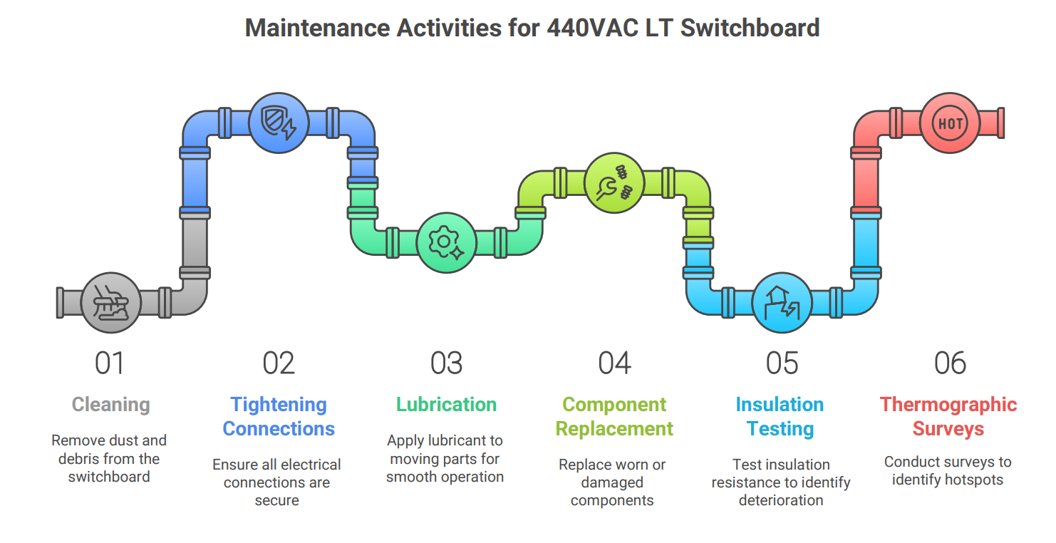 Regular maintenance is essential for ensuring the long-term reliability and performance of the 440VAC LT switchboard. Key maintenance activities include: