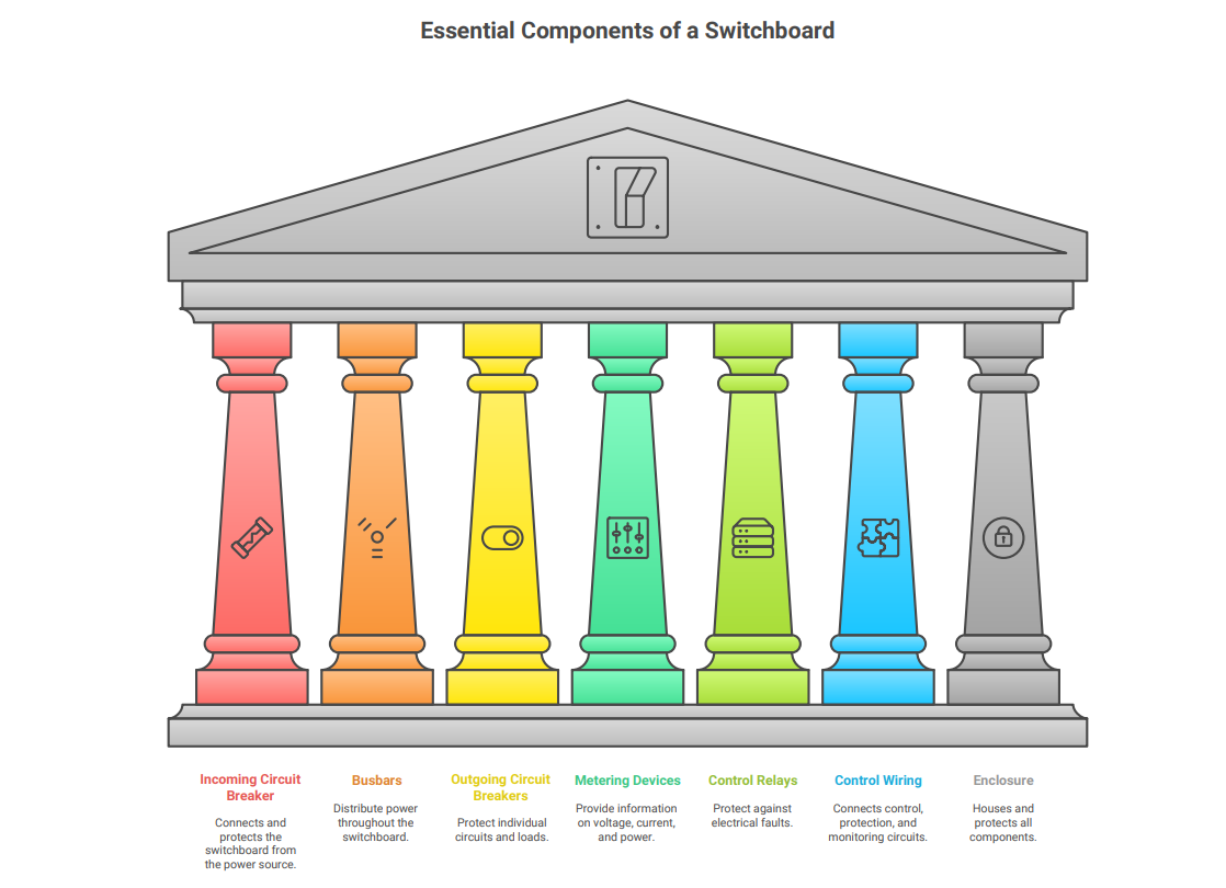 • Incoming Circuit Breaker/Switch: This device provides a means of connecting and disconnecting the switchboard from the power source. It also provides overcurrent and short-circuit protection for the entire switchboard.