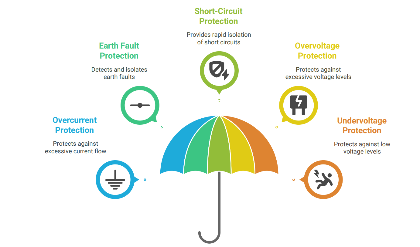• Undervoltage Protection: Protects against low voltage levels, which can cause equipment malfunction. Typically implemented using undervoltage relays.