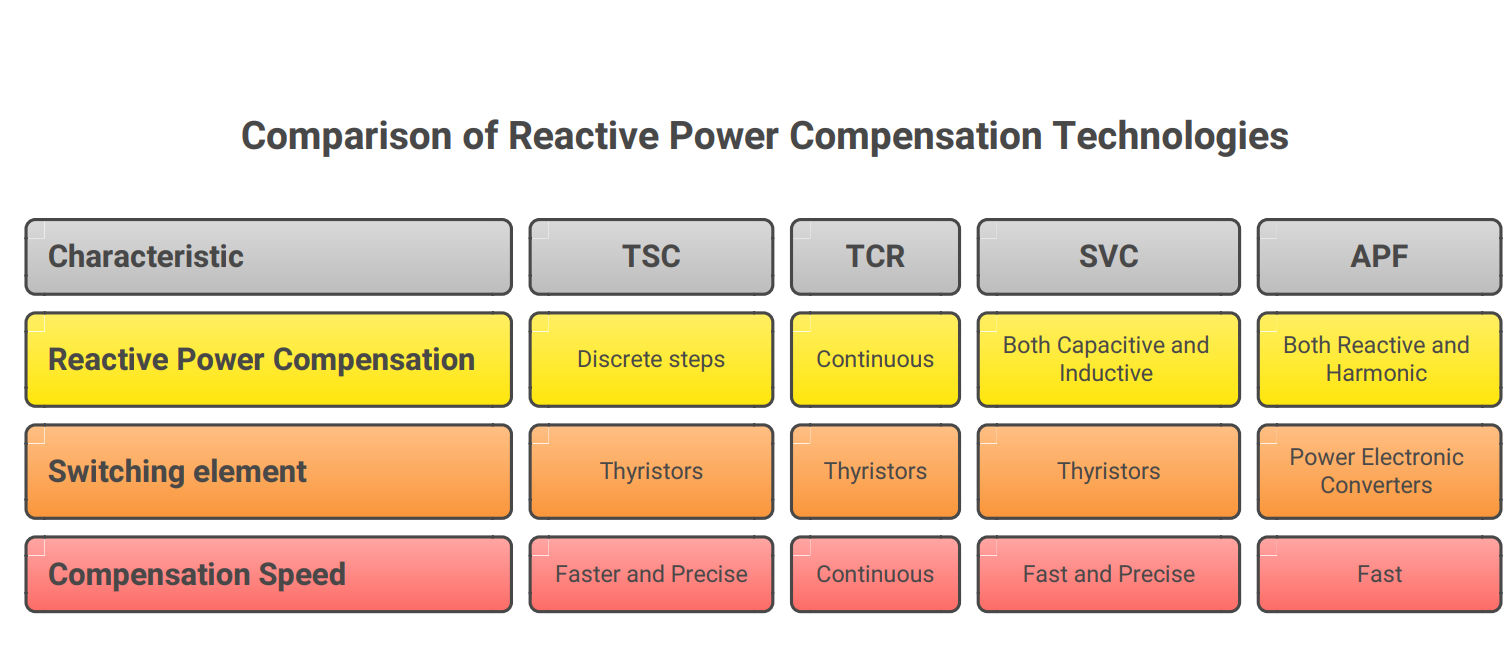 • Thyristor Switched Capacitors (TSC): TSCs use thyristors to switch capacitors in and out of the circuit, providing faster and more precise reactive power compensation compared to traditional capacitor banks.