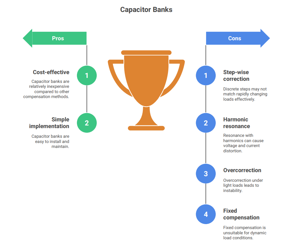 • Overcorrection: Under light load conditions, capacitor banks can overcorrect the power factor, leading to leading power factor and potential instability.