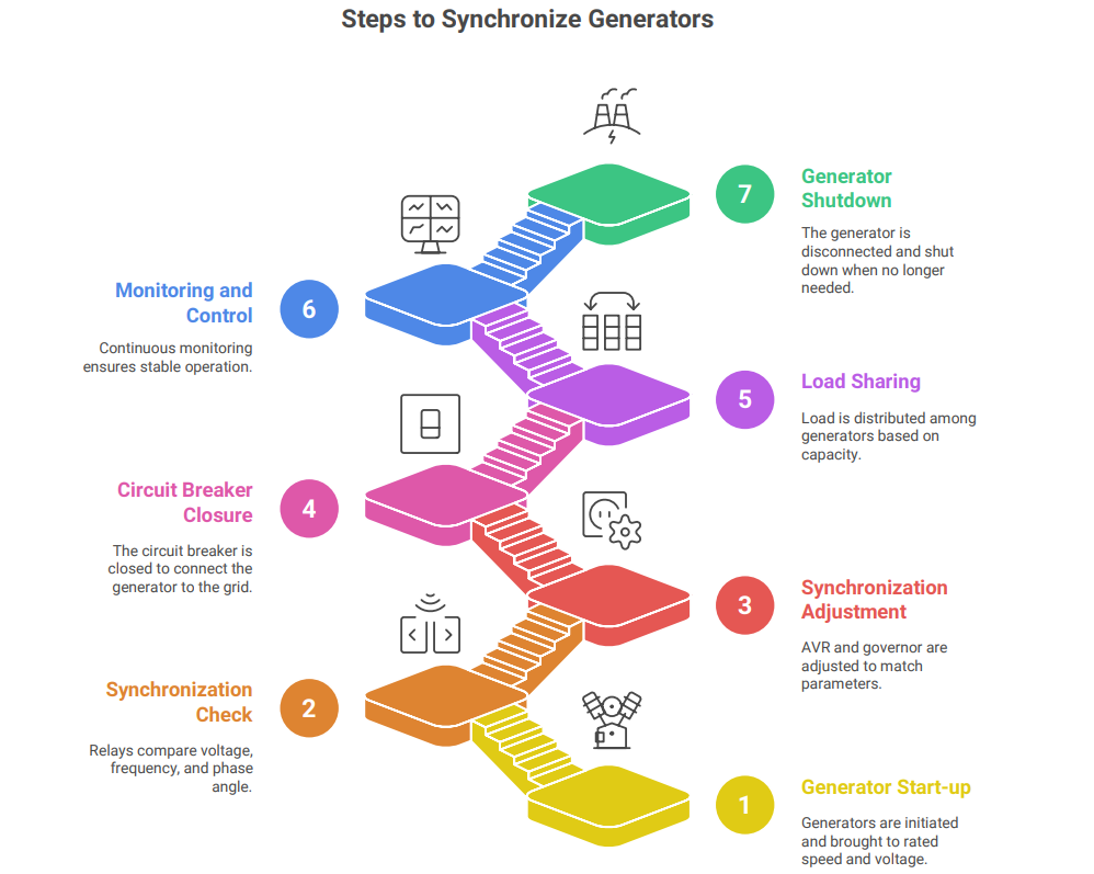 4. Circuit Breaker Closure: Once the synchronization conditions are met, the circuit breaker of the incoming generator is closed, connecting it to the grid.