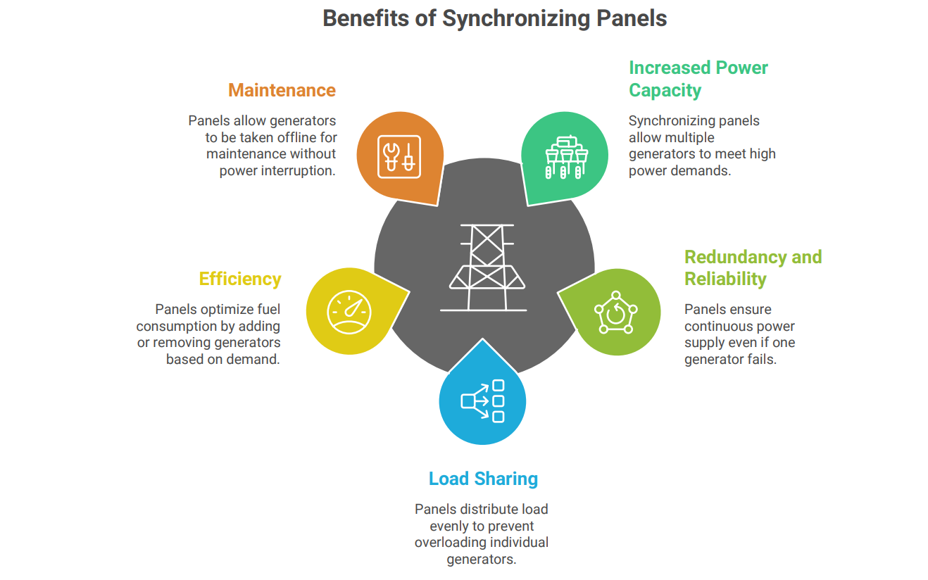 • Load Sharing: Synchronizing panels ensure that the load is shared equally among the generators, preventing overloading of individual units and extending their lifespan.