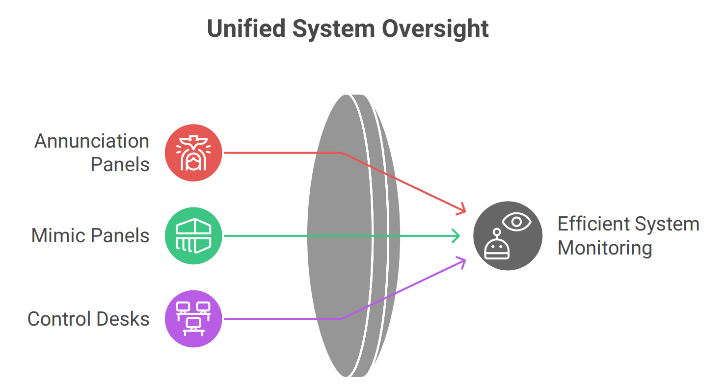 • Hardwired Connections: Discrete signals are wired directly from the control system to the annunciation panel.
