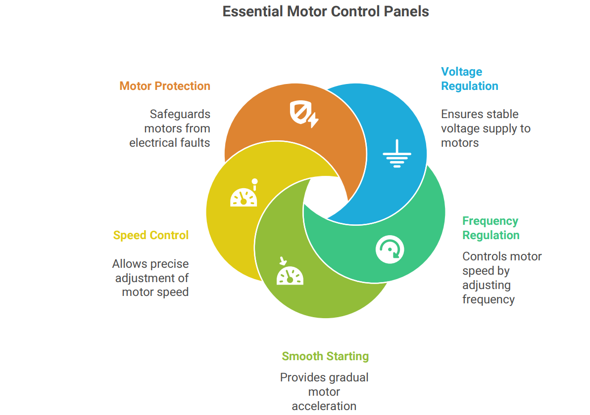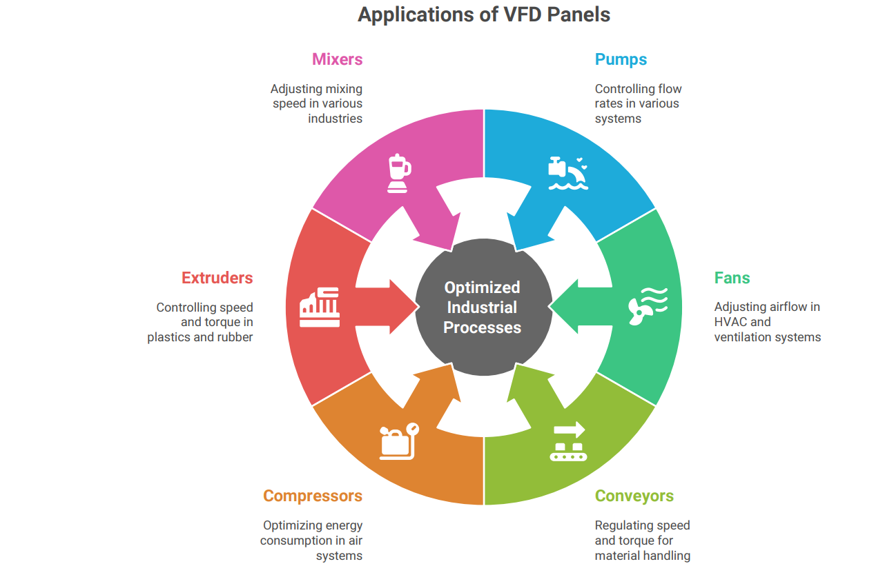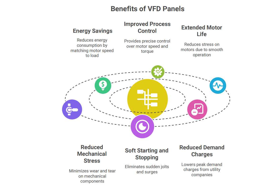 A VFD panel houses a Variable Frequency Drive (also known as an Adjustable Speed Drive or Inverter), which controls the speed of an AC motor by varying the frequency and voltage supplied to it. This allows for precise control over motor speed and torque, optimizing performance and reducing energy consumption.