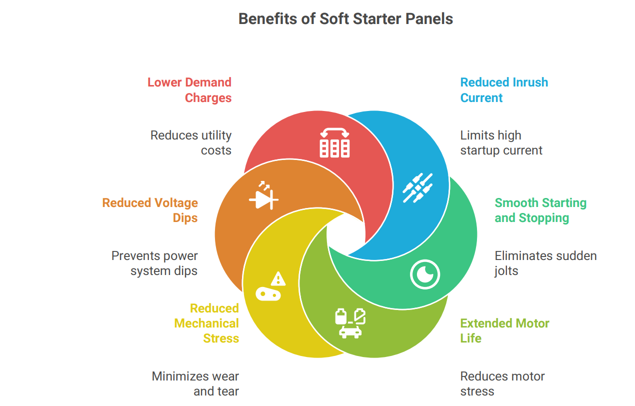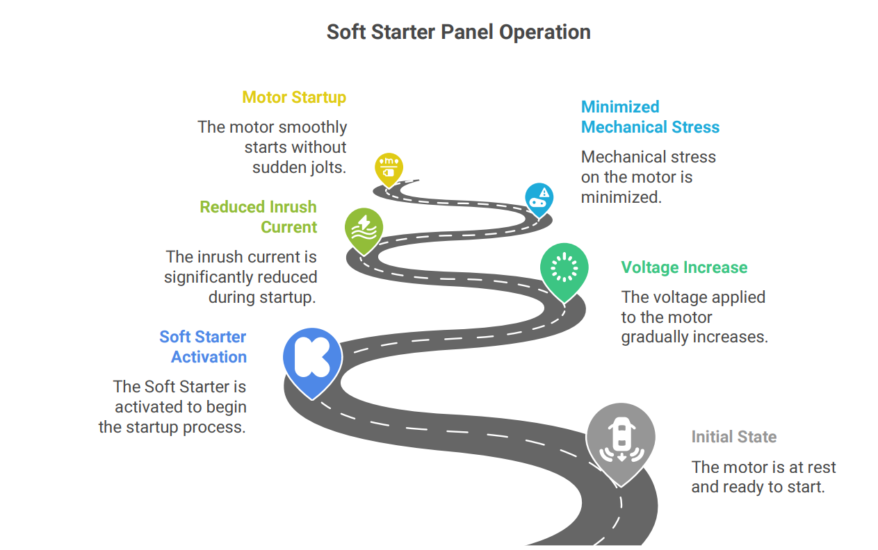 A Soft Starter panel houses a Soft Starter, which gradually increases the voltage applied to an AC motor during startup. This reduces the inrush current and mechanical stress associated with traditional across-the-line starting.